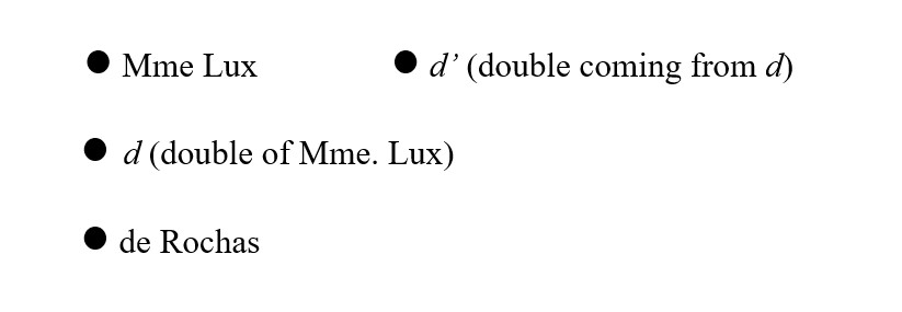 In the case of one subject, Mme Lux (Mme L. Lambert), de Rochas said she observed two doubles emerge from her body, each connected to the other, and both emitting flames.64de Rochas (1897b).He wrote (see diagram below):