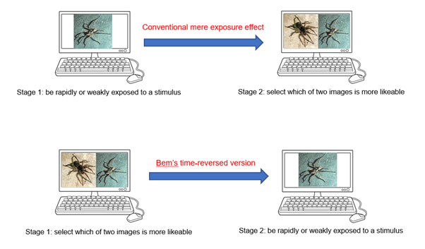 In a 2008 presentation at the Parapsychological Association Convention, Bem introduced three additional time-reversed psychological effects:Precognitive Approach/Avoidance, Retroactive Priming, and Precognitive Memory. For the first of these, the participant is shown a picture and its mirror image side by side and asked to indicate which they prefer. The stimuli were low-arousal, emotionally neutral pictures from the IAPS set, and mirror images were used to ensure that alternatives were exactly matched for likability. After a selection had been made, the computer would randomly designate one of the alternatives as the target; if the participant had selected the target they would be ‘rewarded’ by the subliminal presentation of a positively-valenced picture, but if they had selected the non-target they would be ‘punished’ by being subliminally presented with a negatively-valenced picture. Analysis of data from 150 participants showed a significant preference (51.6%) for the target images that led to subliminal rewards. This represents a time reversed version of a standard reinforcement paradigm.