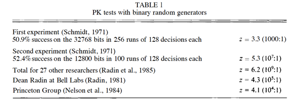 As stated above, the scoring rate in Schmidt’s experiments for a binary RNG was highly significant, a little below 52%, around 2% above the chance mean of 50%.