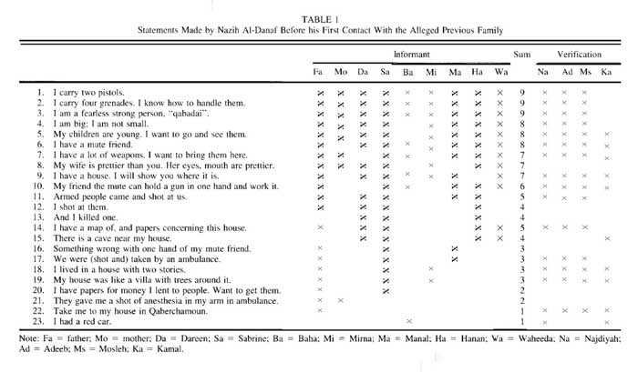 Nazih then correctly identified Fuad’s father’s house and Fuad’s own first house,stating that the wooden ladder in it had been made by Fuad. His first wife, Fida, still lived there, and Nazih correctly identified her as ‘Im Nazih’ (‘mother of Nazih’) since her first-born son by Fuad was also named Nazih. Shown a photograph of Fuad with his two brothers, he correctly identified all three men, as well as their father in another photo. Later Sheikh Adeeb visited Nazih back in Baalchmay, bringing a handgun and asking if it was the one Fuad had given him. Nazih correctly answered no.