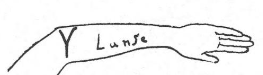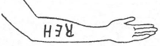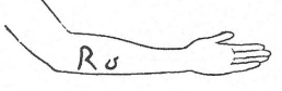 Opening up my fist a little, I allowed her to skim lightly the surface of the folded paper with her fingertips. She thanked me and suggested that I put it away now in one of my pockets. After that she asked me to let her touch my empty hand for a moment. Then she uncovered her left arm. Getting hold of my empty hand with her left one, she then started rubbing part of her bare left forearm with her free hand and asked me to concentrate mentally on the message. Although the rubbing technique seemed to me highly suspicious, I yielded once more to her request, not without making sure with my free hand that the paper was still in my pocket. After about twenty seconds a blurred, reddish sign appeared on her forearm and rapidly acquired the shape or outline of an oblique S.