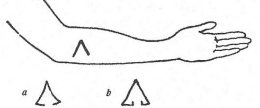 In a second experiment some nine weeks later, Osty prepared twenty slips of paper with drawings of simple designs, chose one randomly (an incomplete triangle) and gazed at it for two seconds, then put it back in with the others and pressed them against Kahl’s forehead. Two lines forming an angle appeared on her forearm; making a drawing, she added the two lines extending toward each other, but left off the upright hooks that were on the original (a and b).