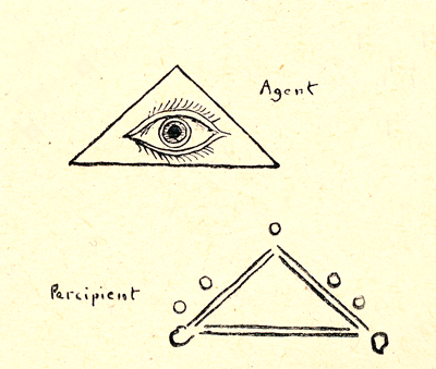 - The agent imagines himself to be the percipient, and dramatizes him as an actor would. He draws the percipient toward himself in imagination.