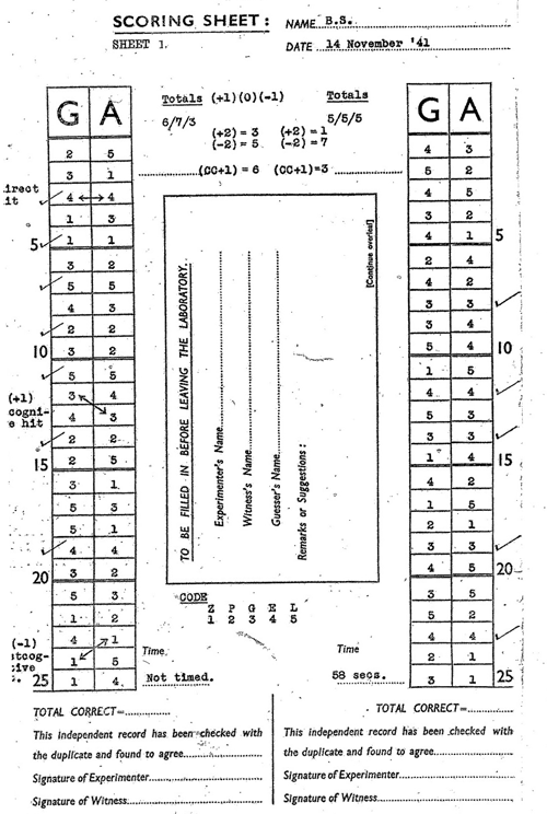 To achieve high scores fraudulently Soal must have altered either the guesses or the targets during the sessions, and before the guesses were decoded, the hits counted, and Bateman took home the score sheets for checking. Further examination revealed that the guess sheets in the archive are also mostly copies. Only guess sheets from the distance tests, and from one test that gave null results, are originals. Evidence for this is threefold. Some guess sheets show indents similar to those found on the score sheets. The guess sheet copies are all on the same batch of forms as was used for the copied score sheet. Gloria Stewart’s signatures at the top of the guess sheets differ from her usual signature or that on the original guess sheets. This point received some confirmation from a sample examined by a handwriting expert. Soal must have had good reason for making all these copies.