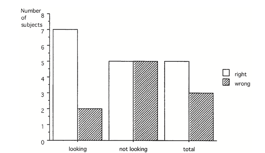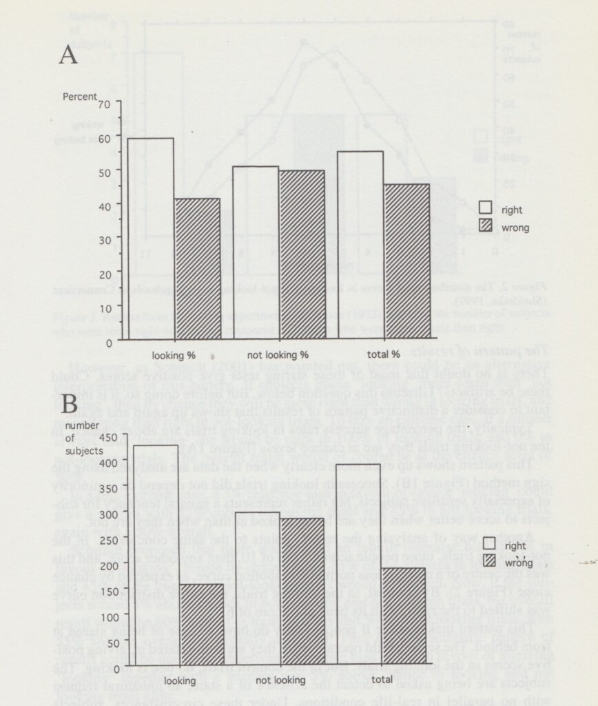 Typically, the percentage success rates in looking trials are above chance. In the not-looking trials they are at chance levels (Figure 1A). This pattern shows up even more clearly when the data are analysed using the sign method (Figure 1B).