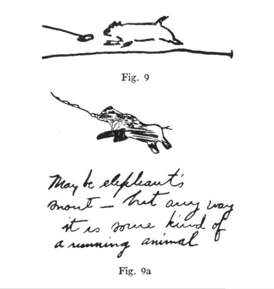 Often the shape was reproduced in outline but misinterpreted with regards to the object it represented. In one such case, a drawing by Upton of a dog chasing an object on a string was tentatively identified by Craig as an elephant’s snout, although the drawings were strikingly similar.
